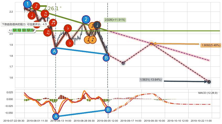 ♘ 在最后的下跌阶段2019-07-22 10:30至2019-08-30 15:00,存在 持续未破位的阻力位 ,阻力价格2.026,可信任强度88.58%,其距离最后价格1.8100相差 +11.91%