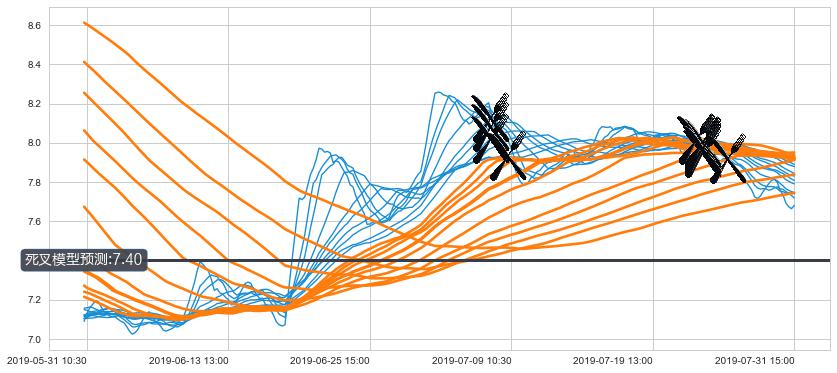 ➢ 70小时均线于(07-24 11:30: 7.97)形成【死叉】基于【死叉历史模型】预测死叉后最低波谷价格: 7.50, 死叉后最低价格7.62,尚未达到预测最低波谷价格, 预期继续下跌