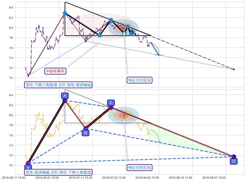 ➢ 下降三角整理属【中级别信号事件】谐波蝙蝠属【长级别信号事件】中长周期组合信号事件,中长事件长度比58.38%