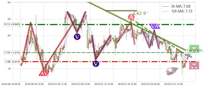 ➣ 预测:2019-08-07 14:00,【继续下探】稳定目前下跌趋势的前提下,预测价格:7.52