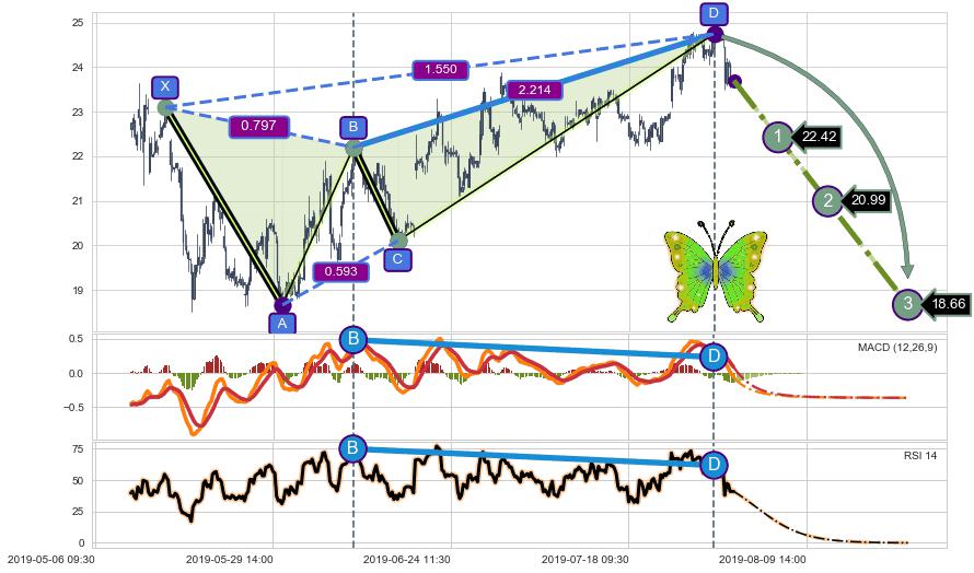 ➣ 谐波蝴蝶:已到达d点:猜想c拉升到达d点后泄力性下沉下跌(均值回复)