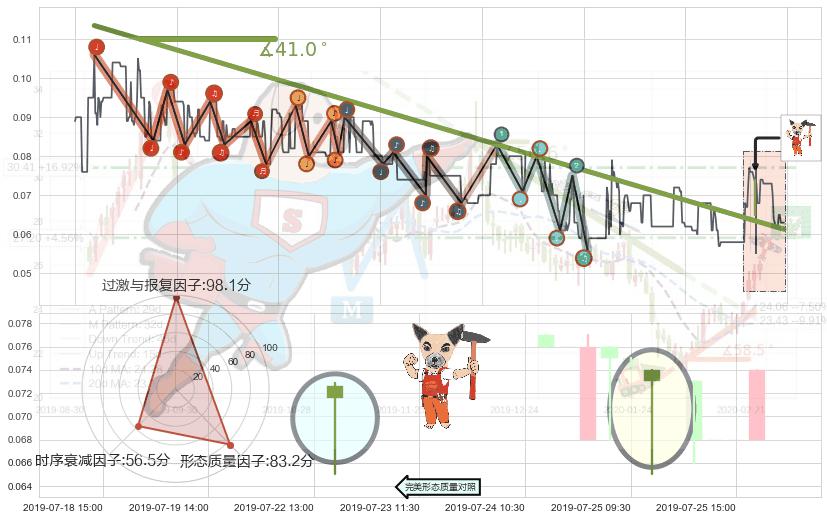 从2019-05-23 15:00至2019-06-20 13:00,共包含113个小时,阶段股价下跌-15.72%,阶段股价变动位移路程比: 1 : 16,下跌趋势角度: 49.7