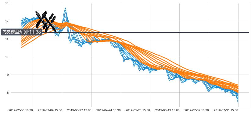 ➣ 80小时均线于(02-14 15:00: 12.10)形成【死叉】基于【死叉历史模型】预测死叉后最低波谷价格: 11.38, 死叉后最低价格7.39,已经下跌超出预测最低波谷价格, 预期反弹