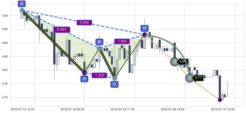 ➣ 谐波蝴蝶:c下跌到达d:猜想拉升 → 上涨 →【拐点】强支撑临近 → 大趋势均值回复