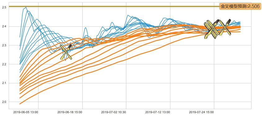 ➣ 40小时均线于(07-24 09:30: 2.379)形成【金叉】基于【金叉历史模型】预测金叉后最高波峰价格: 2.505, 金叉后最高价格2.440,尚未达到预测最高波峰价格, 预期继续上涨