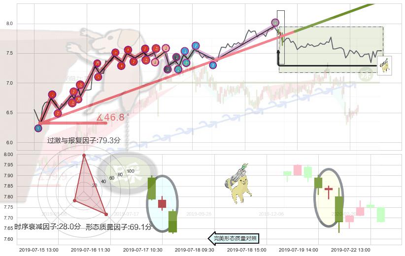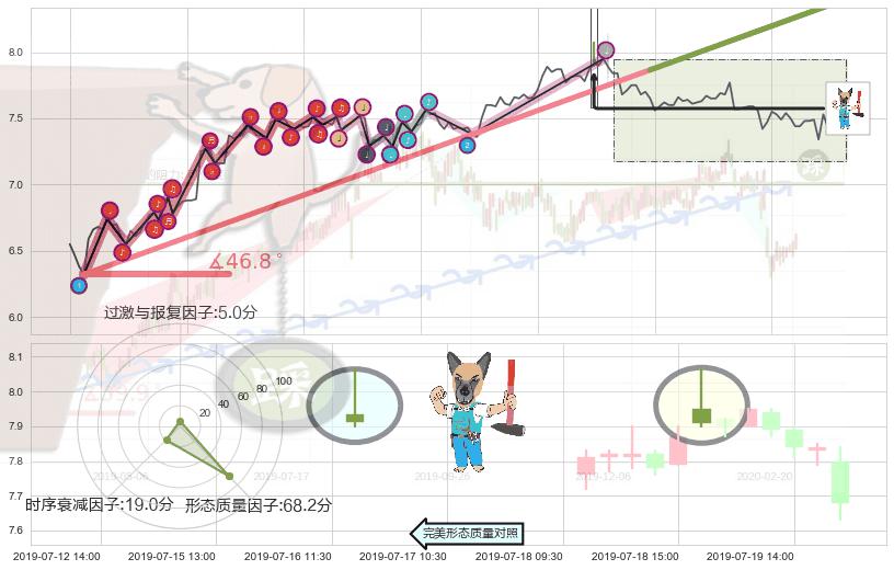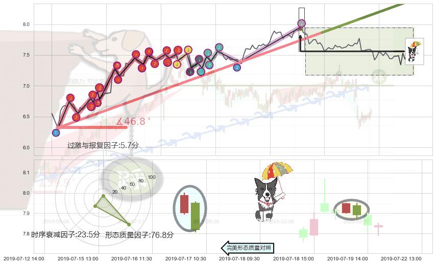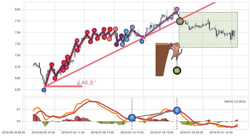 从2019-06-21 15:00至2019-07-23 09:30,共包含122个小时,阶段股价上涨19.73%,阶段股价变动位移路程比: 1 : 4,上涨趋势角度: 46.8