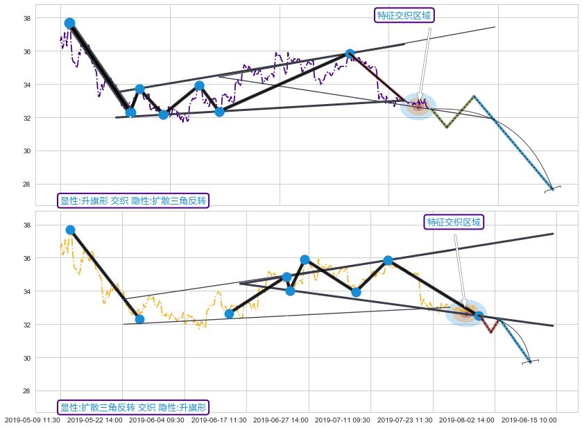 ➣ 扩散三角反转:猜想临近关键支撑位突破点 → 临近拐点下跌 → 风险信号 → 大趋势均值回复