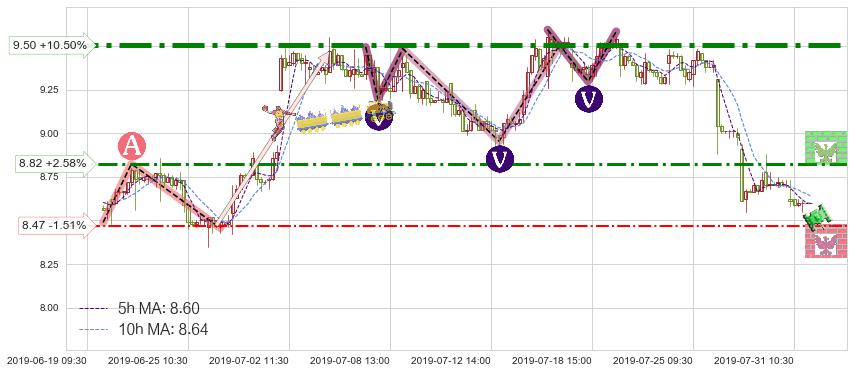♘ 阻力价格位8.82,可信任强度58.39%,距离最后交易2019-07-31 15:00形成的收盘价格8.60相差 +2.58%