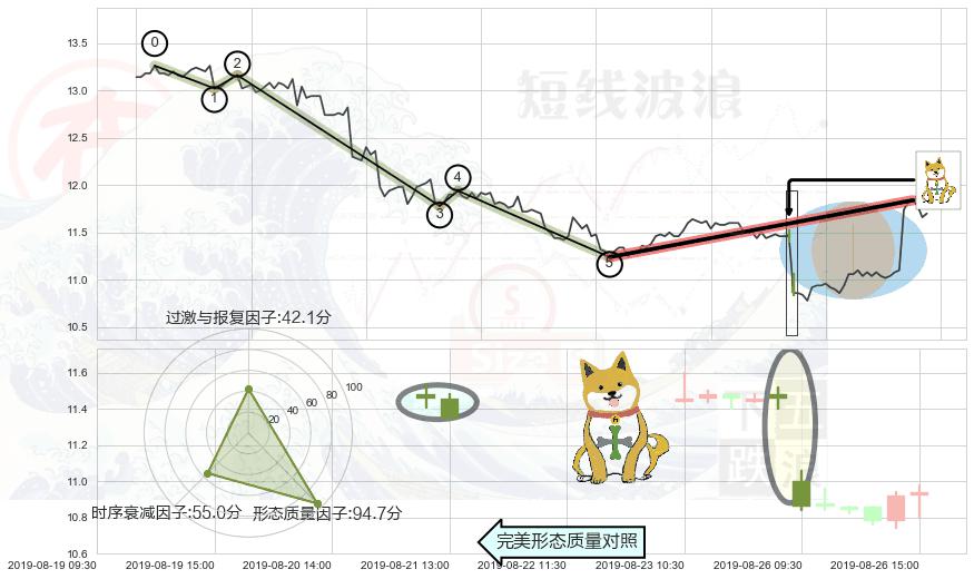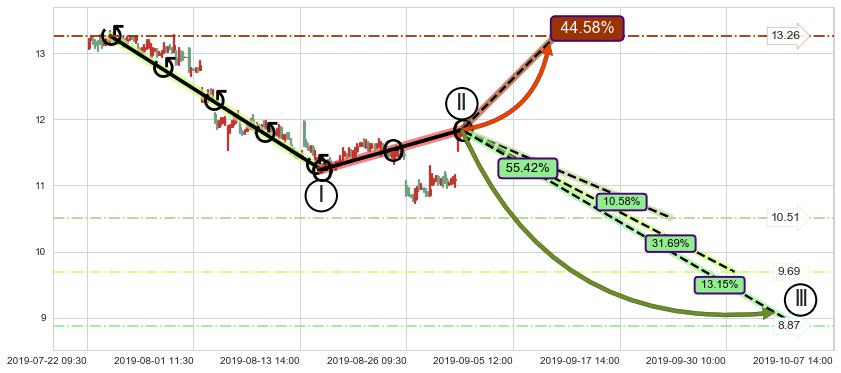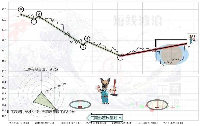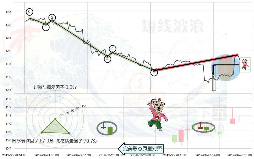 从2019-08-14 13:00至2019-08-26 13:00,共包含49个小时,阶段股价下跌-6.97%,阶段股价变动位移路程比: 1 : 3