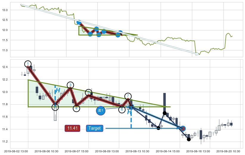 ➣ 【已确认突破】下降三角形整理 起点:08-02:13,突破点:08-12:10,形态共35交易小时