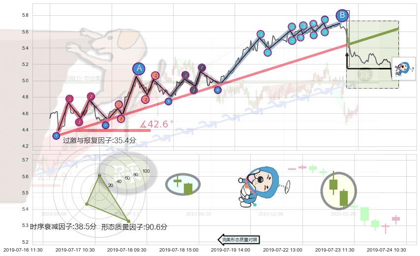 ➢ 2019-05-27 09:30-2019-07-23 11:30上升趋势存在反转[风险],其原上升趋势的支撑位(5.63)已破位[强阻力信号],原上升趋势角度: 42.6˚