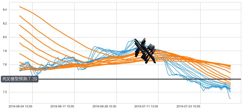 ➢ 55小时均线于(07-05 15:00: 7.84)形成【死叉】基于【死叉历史模型】预测死叉后最低波谷价格: 7.53, 死叉后最低价格7.08,已经下跌超出预测最低波谷价格, 预期反弹