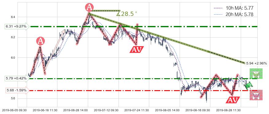 ♘ 在最后的下跌阶段2019-07-02 09:30至2019-08-15 13:00,存在 持续未破位的阻力位 ,阻力价格5.94,可信任强度74.95%,其距离最后价格5.77相差 +2.96%