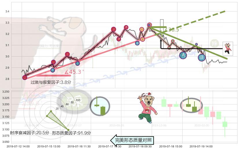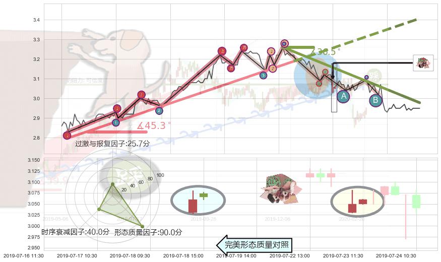 ➣ 2019-06-21 15:00-2019-07-18 10:30上升趋势存在反转[风险],其原上升趋势的支撑位(3.406)已破位[强阻力信号],原上升趋势角度: 45.3˚