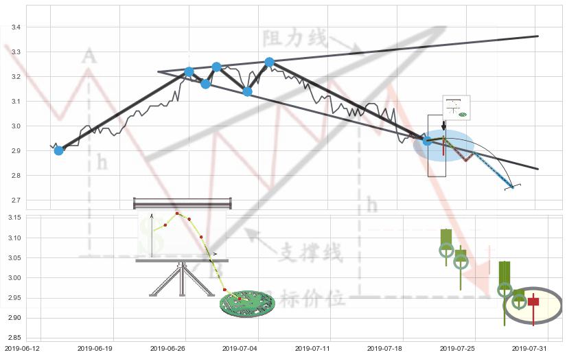 ♘ 在最后的下跌阶段2019-07-17 11:30至2019-07-30 13:00,存在 持续未破位的阻力位 ,阻力价格2.978,可信任强度68.74%,其距离最后价格2.950相差 +0.95%