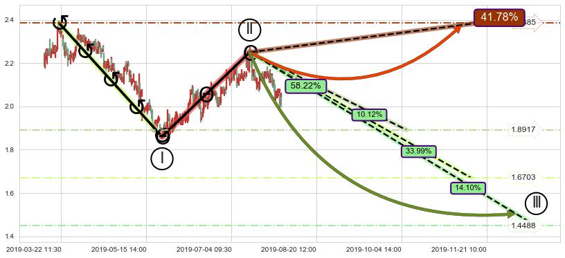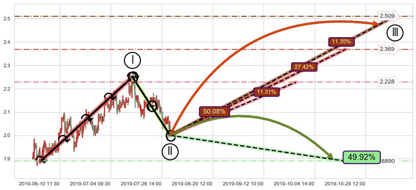 ➣ 调整浪已超过预测的c点位置,后续大趋势循环浪继续下跌概率58.22%,谨慎做多