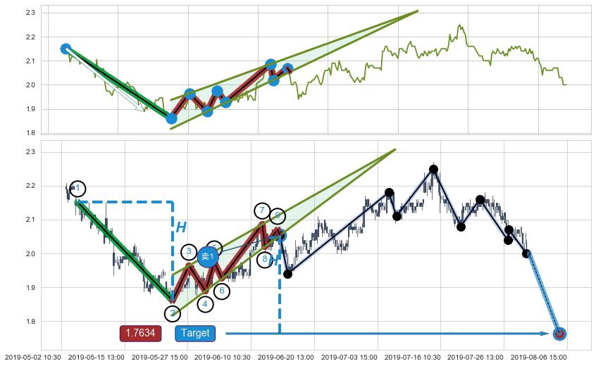 ➣ 升旗形:猜想预期下跌目标target即将达成,随后猜想强支撑来临,预期反弹上涨(均值回复)