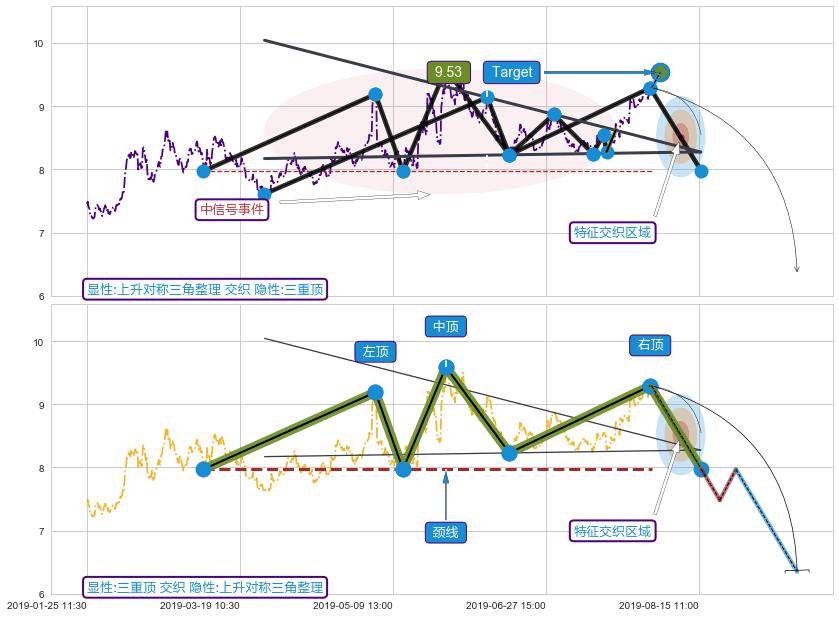 ➢ 上升对称三角整理属【中级别信号事件】三重顶属【长级别信号事件】中长周期组合信号事件,中长事件长度比63.98%