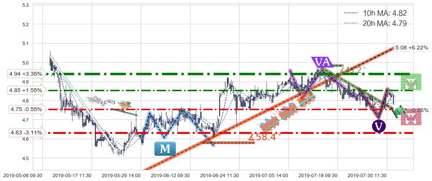 ♘ 阻力价格位4.94,可信任强度90.51%,距离最后交易2019-07-31 15:00形成的收盘价格4.78相差 +3.35%