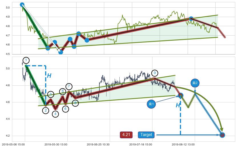 从2019-07-23 14:00至2019-07-31 15:00,共包含38个小时,阶段股价下跌-1.21%,阶段股价变动位移路程比: 1 : 10