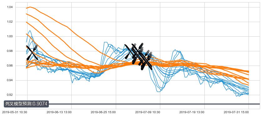 ➢ 60小时均线于(07-02 15:00: 0.9717)形成【死叉】基于【死叉历史模型】预测死叉后最低波谷价格: 0.9106, 死叉后最低价格0.9100,虽然已经到达预测最低波谷价格,但耗时间很短动能很强, 预期继续下跌