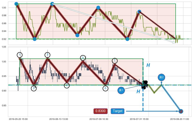 ➣ 最小中继整理跌幅→𝐇: 0.0900000 (上平行阻力线与下平行支撑线的垂直距离)