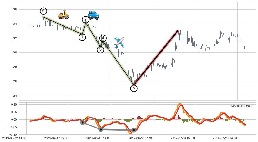 从2019-06-24 10:30至2019-07-05 15:00,共包含53个小时,阶段股价下跌-9.09%,阶段股价变动位移路程比: 1 : 5