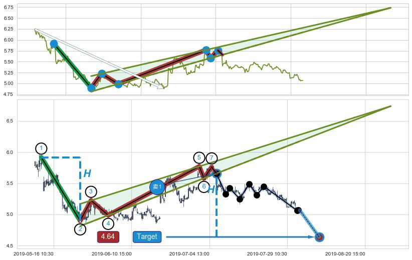 ➣ 最小中继整理跌幅→𝐇: 0.6624 (下侧直角边第一支撑点②与斜边垂直距离)