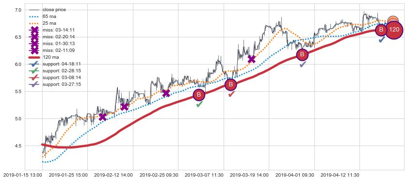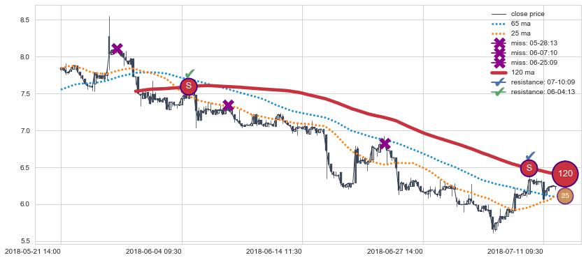 ➢ 最优均线组合共正确确认支撑阻力信号18处,正确确认率 64.29%