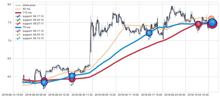 ➢ 最优均线组合共正确确认支撑阻力信号23处,正确确认率 76.67%