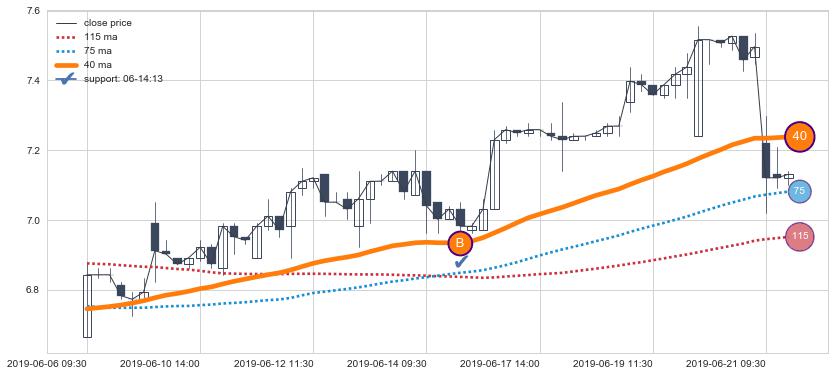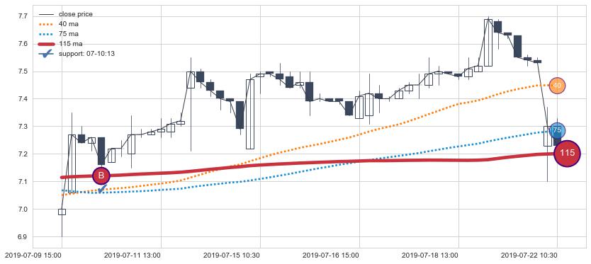 ➢ 75小时均线于(07-09 15:00: 7.07)形成【金叉】基于【金叉历史模型】预测金叉后最高波峰价格: 7.53, 金叉后最高价格7.70,已经上涨超出预测最高波峰价格, 预期回调