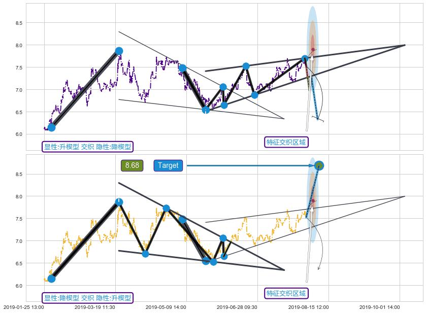 ➢ 降楔型:猜想预期上涨目标target即将达成,随后猜想强阻力来临,预期回调下跌(均值回复)