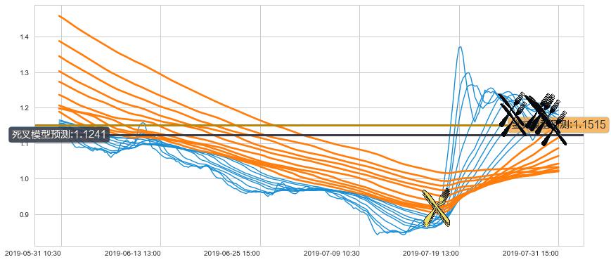 ➣ 60小时均线于(07-30 15:00: 1.1708)形成【死叉】基于【死叉历史模型】预测死叉后最低波谷价格: 1.1278, 死叉后最低价格1.1200,虽然已经到达预测最低波谷价格,但耗时间很短动能很强, 预期继续下跌