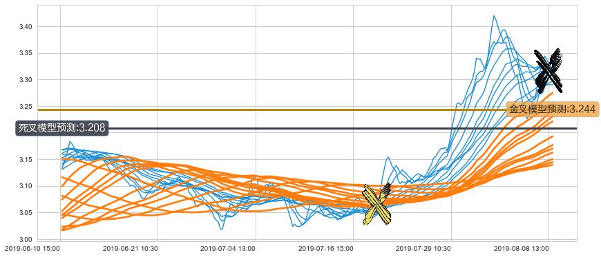 ➢ 40小时均线于(08-08 11:30: 3.325)形成【死叉】基于【死叉历史模型】预测死叉后最低波谷价格: 3.222, 死叉后最低价格3.290,尚未达到预测最低波谷价格, 预期继续下跌