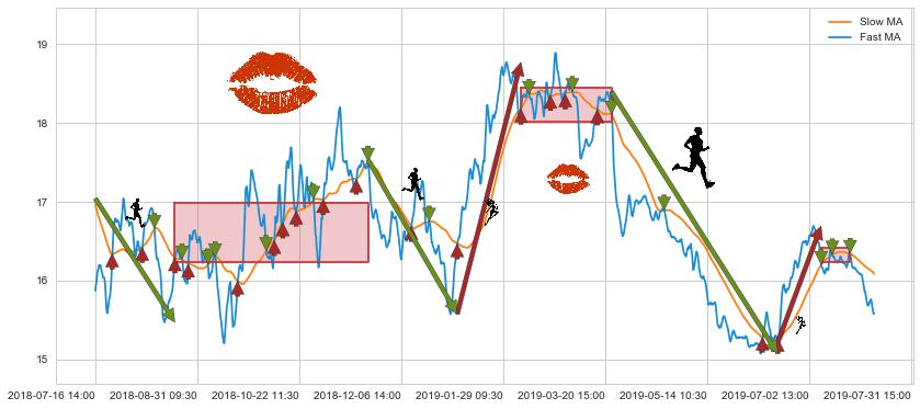 07-08 13:00至07-22 09:30 慢线与快线多次接触,存在上下穿越,有缠绕