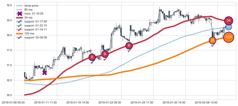 ➢ 最优均线组合共正确确认支撑阻力信号10处,正确确认率 50.00%
