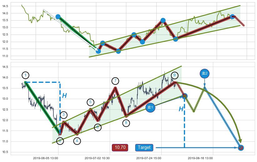 ➣ 升旗形:猜想临近关键支撑位突破点 → 临近拐点下跌 → 风险信号 → 大趋势均值回复