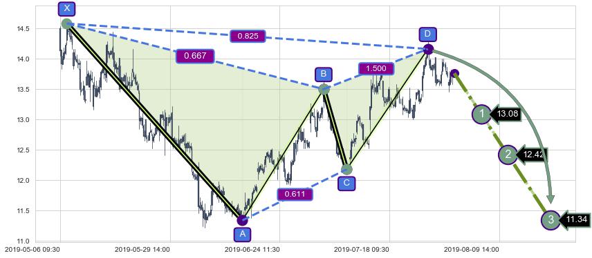 ➢ 谐波伽利:c上拉到达d:猜想下沉 → 下跌 →【拐点】强阻力临近 → 大趋势均值回复