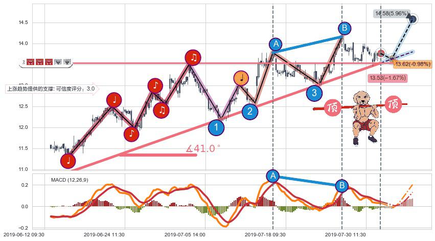 🍖 长线趋势跟踪组合短线均值回复[强支撑信号]2019-06-14 14:00-2019-07-29 15:00上升趋势依然成立(上涨趋势跟踪依然可行),短线价格略微下行回调(均值回复猜想),即将接近趋势提供的未破位的支撑价格:13.53。