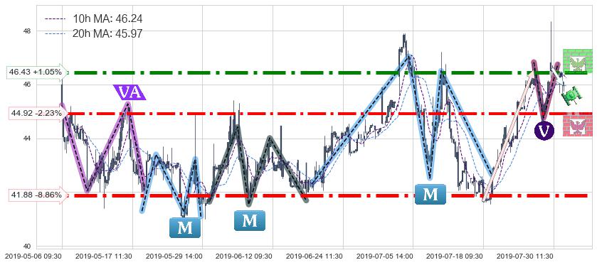 ♘ 阻力价格位46.43,可信任强度93.73%,距离最后交易2019-07-31 15:00形成的收盘价格45.95相差 +1.05%