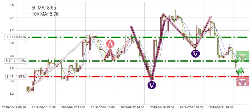 ♘ 阻力价格位8.71,可信任强度75.46%,距离最后交易2019-07-31 15:00形成的收盘价格8.62相差 +1.10%