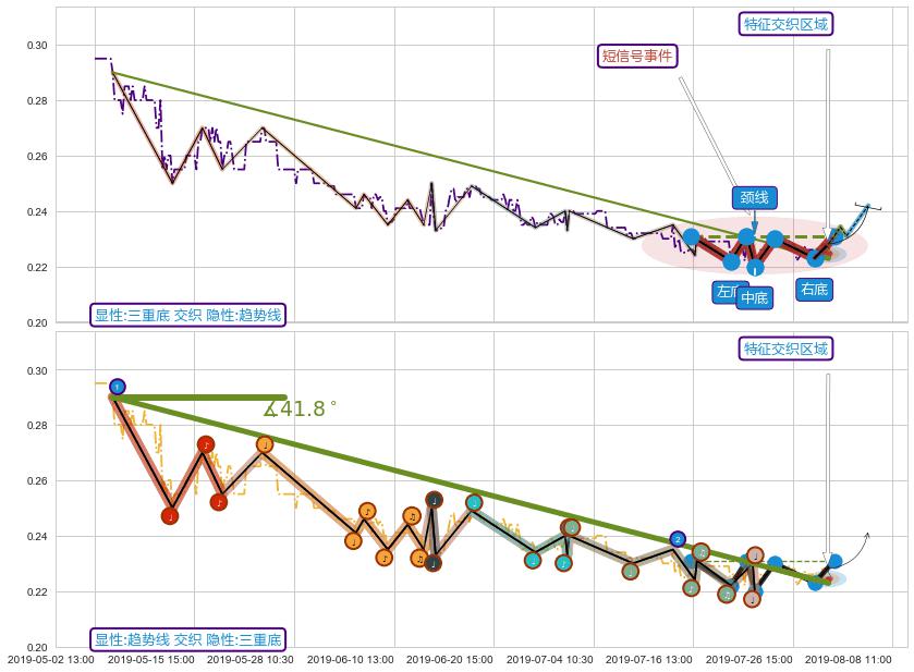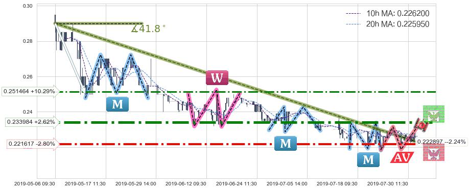 🦴 长线均值回复组合短线趋势跟踪[强阻力信号]2019-05-06 09:30-2019-07-25 10:30下跌趋势依然成立(下跌趋势跟踪依然存在),短线价格略微上行反弹(均值回复猜想),即将接近下跌趋势提供的未破位阻力价格:0.222897。
