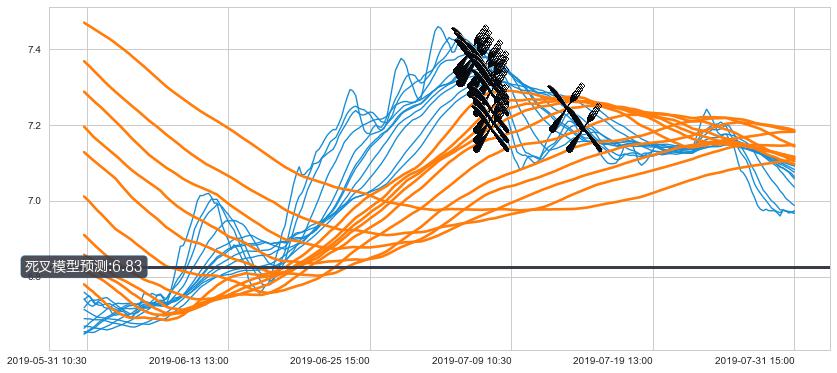 ➢ 55小时均线于(07-05 15:00: 7.33)形成【死叉】基于【死叉历史模型】预测死叉后最低波谷价格: 6.96, 死叉后最低价格6.94,虽然已经到达预测最低波谷价格,但耗时间很短动能很强, 预期继续下跌