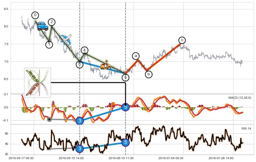 从2019-01-30 13:00至2019-03-08 14:00,共包含143个小时,阶段股价上涨11.50%,阶段股价变动位移路程比: 1 : 8