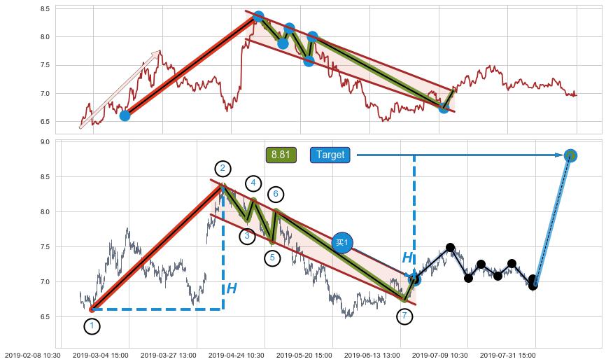 ➢ 支撑位【③⑤⑦】波动逐渐走低,构成【旗形】下平行线