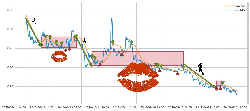 05-15 14:00至08-02 09:30 慢线与快线多次接触,存在上下穿越,有缠绕