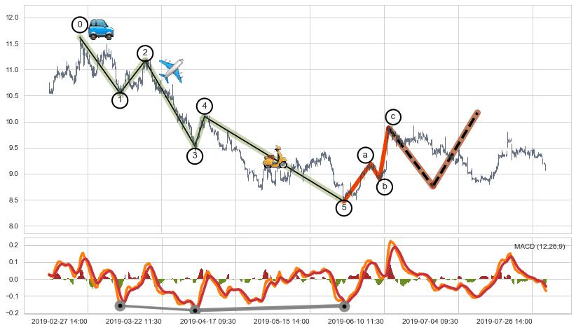 ➢ 波浪理论:猜想击穿突破c点后继续上涨 → 上涨 → 机会信号 → 小趋势跟踪