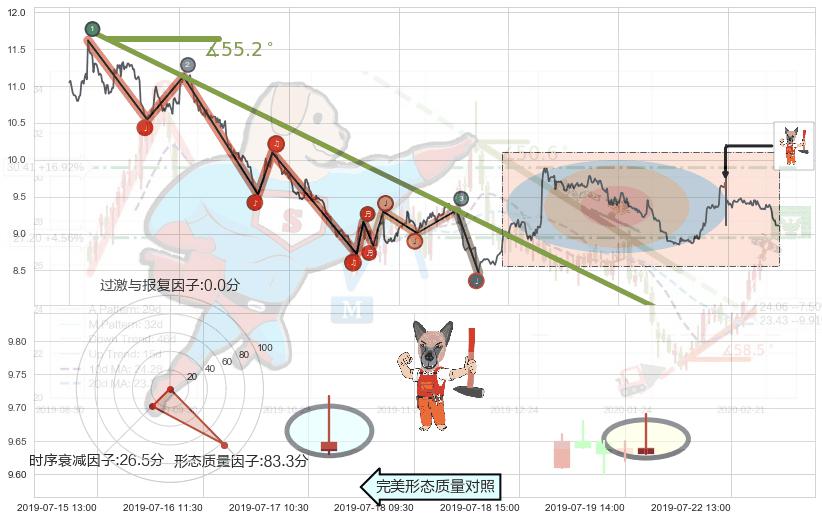 从2019-02-26 09:30至2019-06-04 10:30,共包含392个小时,阶段股价下跌-22.94%,阶段股价变动位移路程比: 1 : 8,下跌趋势角度: 55.2