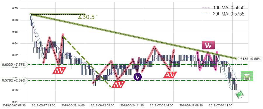 ♘ 阻力价格位0.6035,可信任强度45.81%,距离最后交易2019-07-31 15:00形成的收盘价格0.5600相差 +7.77%