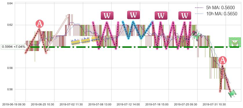 ♘ 阻力价格位0.5994,可信任强度89.55%,距离最后交易2019-07-31 15:00形成的收盘价格0.5600相差 +7.04%
